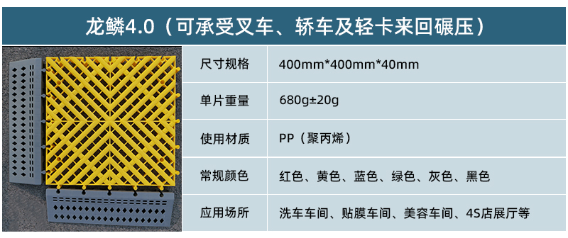 1.龍鱗紋設(shè)計(jì),防滑,美觀,寓意好 2.選用高級(jí)原料,加入其他輔料,顏色亮麗,無異味,無污染 3.顏色為紅黃藍(lán)綠黑灰六色,滿足客戶用色需求,搭配屬于自己的風(fēng)格 4.通扣鎖扣設(shè)計(jì),容易鋪設(shè)且容易拆卸打理 5.加強(qiáng)支撐,不容易出現(xiàn)壓壞壓斷現(xiàn)象,滿足大多數(shù)車輛施工的要求 6.使用年限長,3年超長質(zhì)保,使用無后顧之憂 7.不同厚度,采用不同支撐,保證承載最大化的同時(shí),且易排泥排水
